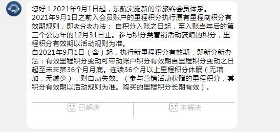 18日上昼,潮新闻记者干系了东方航空在线客服,客服恢复称:自2021年9月1日(含)起,东航扩充新里程积分有用期,有用里程积分变动可带动账户积分有用期自里程积分变动之日起至往日第36个月月底。连气儿36个月以上里程积分睡眠(无增多,无减少),则自动失效。
